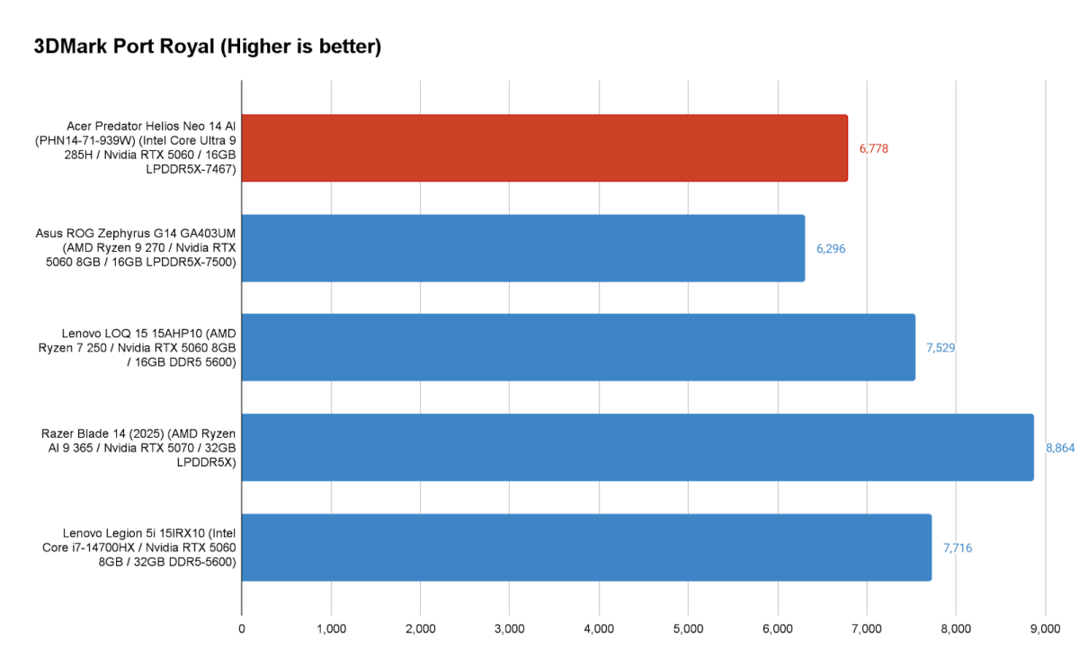 A powerful CPU is a good accomplice for a GPU, although energy and cooling can usually be the larger components in laptops. While the Predator Helios Neo 14 AI reveals stable efficiency in 3DMark’s Port Royal check, edging out the Asus ROG Zephyrus G14 GA403UM that wields the identical GPU (however with a 100W energy restrict), Acer nonetheless falls behind each of Lenovo’s methods. Even with its Turbo energy setting boosting its rating to 7,337 factors, it lags behind these two and fails to catch as much as the Razer Blade 14’s RTX 5070.