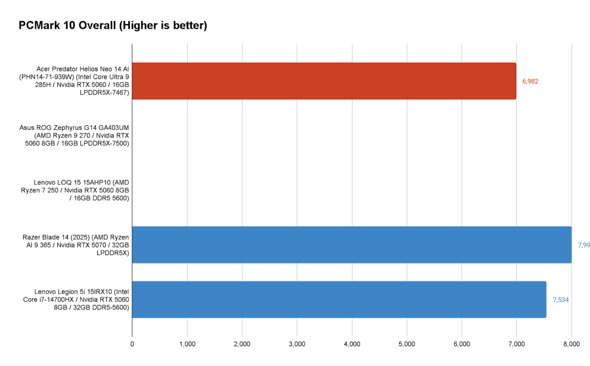 PCMark 10 reveals off the Predator Helios Neo 14 AI’s robust normal efficiency, with it delivering a extremely passable rating. Some gaming laptops push larger due to much more potent GPUs than the RTX 5060, however something above 5,000 factors is kind of good.