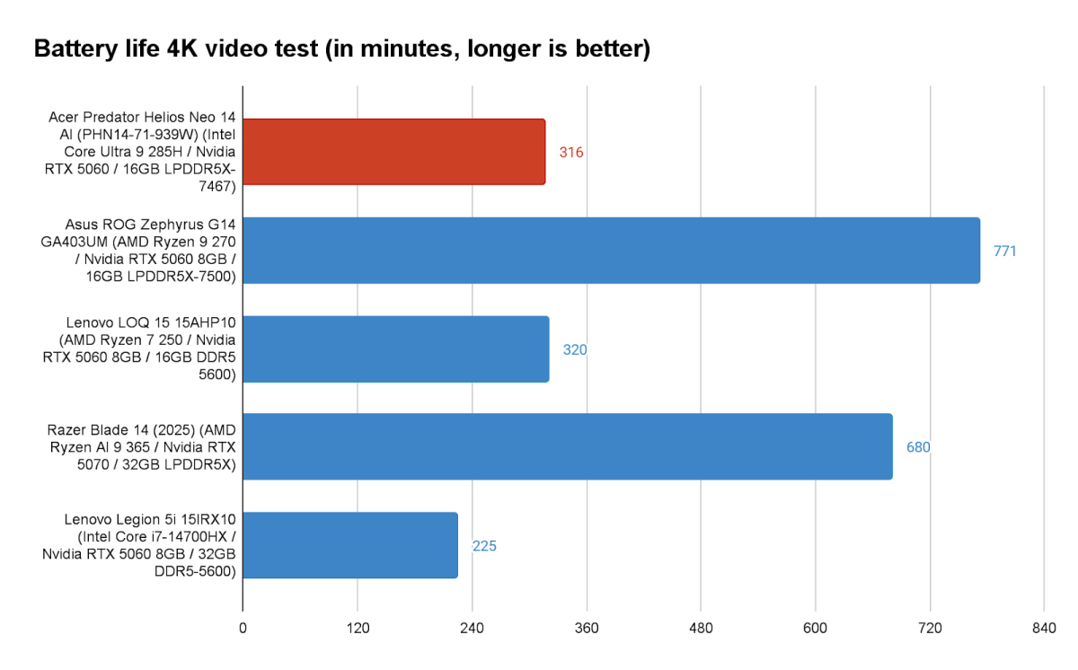 Performance and battery life are a positive balancing act, and although the Predator Helios Neo 14 AI doesn’t do horribly, it additionally doesn’t impress. It ran our 4K native video playback check for simply over 5 hours earlier than its 76Wh battery was drained. That provides it a much-needed win over the Lenovo Legion 5i 15IRX10, which dogged it in efficiency benchmarks.