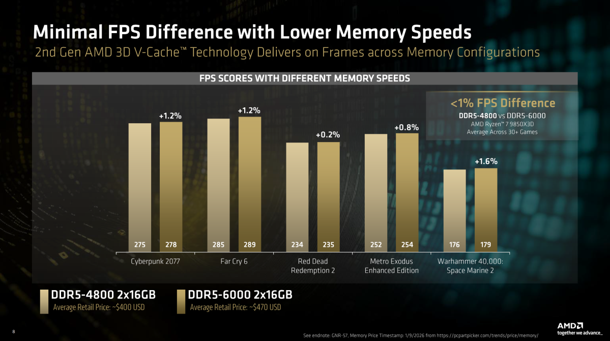 AMD is speaking up this level once more for the 9850X3D, claiming that taking place to DDR5-4800 RAM will solely lose you 1 p.c of efficiency in comparison with DDR5-5600. Given how comparable the 9800X3D and 9850X3D carry out, that probably means you gained’t endure a dramatic distinction if selecting between DDR5-4800 and DDR5-6000 RAM for a construct. You can avoid wasting money.