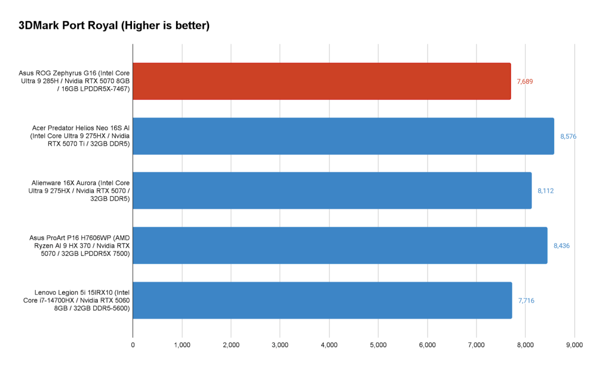 The curious factor is that the Asus ROG Zephyrus G16 isn’t restricted to that efficiency stage, however Asus simply defaults to it. In reality, utilizing the laptop computer’s Turbo profile, its Port Royal rating leaps as much as 8,552 factors. This form of bump from altering energy profiles is pretty frequent, however the reality Asus’s default Performance profile sees the RTX 5070 nerfed to RTX 5060 ranges is an odd selection that its opponents don’t appear to be making.