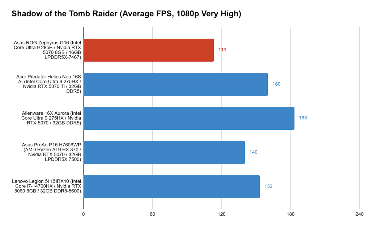 The shortcoming in graphical efficiency stemming from Asus’s settings mix with the weaker CPU within the system to depart the Asus ROG Zephyrus G16 falling behind the pack in precise video games. We see it lag the entire area in Shadow of the Tomb Raider, which tends to lean a bit extra closely on the CPU than another video games, thus giving these programs with extra highly effective processors an edge. Again, enabling Turbo mode brings the Asus ROG Zephyrus G16’s common body charge as much as 159.