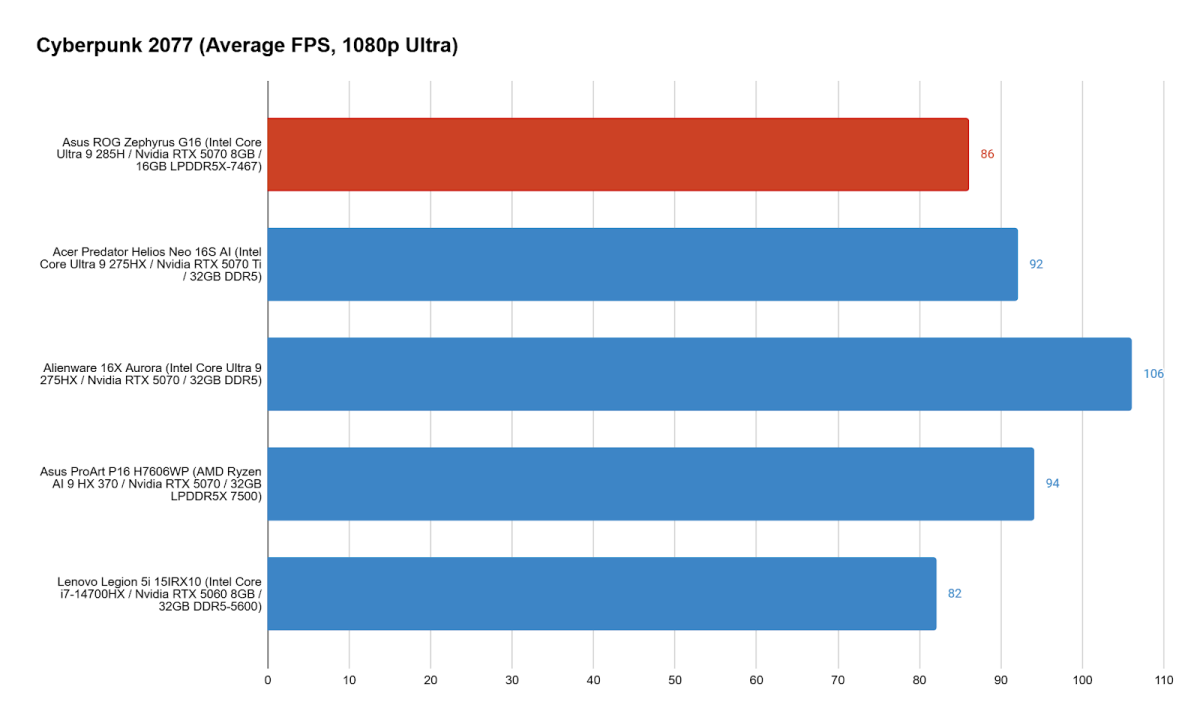 Cyberpunk 2077 is an particularly demanding sport, sufficient in order that even the power-limited RTX 5070 may ultimately come out forward of the Legion’s RTX 5060, doubtless aided alongside by the quicker single-core efficiency of the CPU, which tends to enhance body charges. The Asus ROG Zephyrus G16 doesn’t pull forward of its opponents although, until Turbo mode is enabled, then its common body charge jumps to 99.