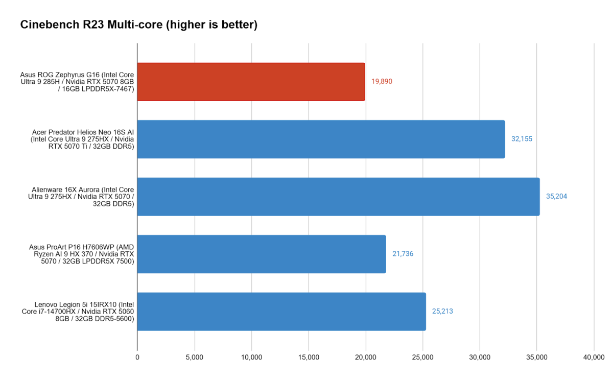 The Intel Core Ultra 9 285H’s single-core efficiency is great, nevertheless it’s no match for HX-series CPUs from Intel, which a lot of its opponents embody. Across Cinebench R15, R20, R23, and R24, it falls nicely behind. This decrease efficiency additionally sees it take longer in our Handbrake video encoding check. While warmth may very well be an element for the skinny Asus ROG Zephyrus G16 in Cinebench R24’s and Handbrake’s longer checks, the decrease efficiency in Cinebench R15, R20, and R23, that are a lot faster, suggests it’s only a limitation of this CPU subsequent to the competitors.