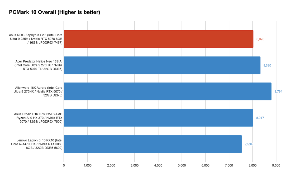 We can see within the holistic PCMark 10 benchmark that the Asus ROG Zephyrus G16 provides loads of pace for on a regular basis workplace duties and even artistic workloads, dramatically exceeding the 5,000-point threshold that tends to mark a machine that’ll readily deal with most workplace duties. It largely retains tempo with comparable programs operating Intel and AMD {hardware}.
