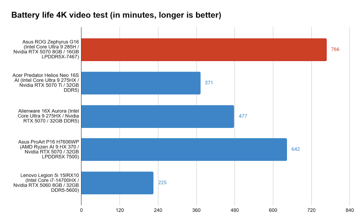 Conservative energy administration tends to have a profit the place battery life is worried, and that proves the case for the Asus ROG Zephyrus G16. In our offline video playback checks, which run a domestically saved 4K video on repeat with the show brightness set between 250 and 260 nits, the Asus ROG Zephyrus G16 managed a powerful 12 hours and 46 minutes, exhibiting previous Asus’s personal ProArt 16 and dramatically outpacing the opposite programs operating on HX-series Intel processors.