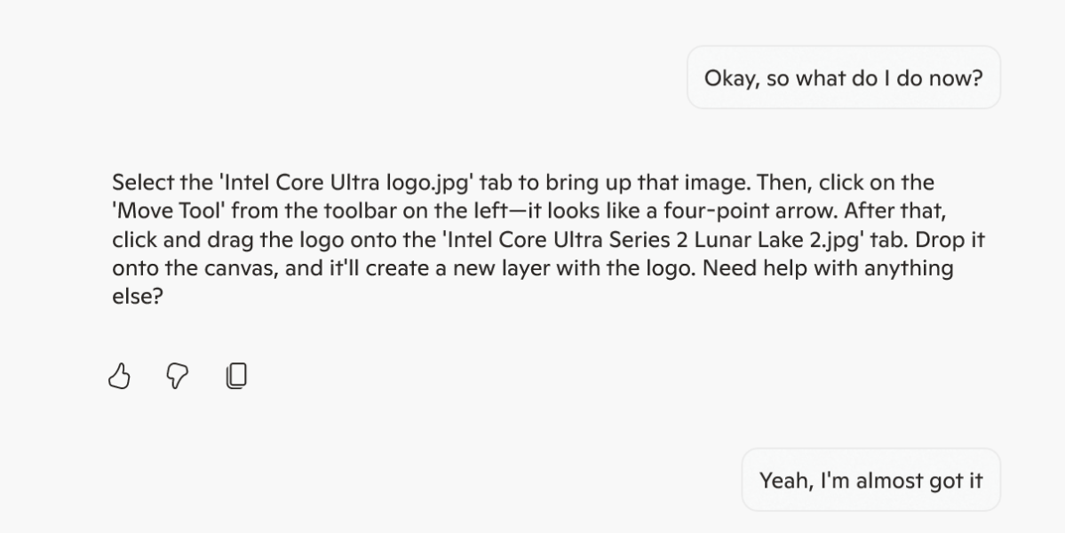 This is the place Copilot Vision shined, as I went backwards and forwards including photos to completely different layers and making changes. The one factor it does not do is visually spotlight components on the display so that you can work together with — as Microsoft initially demonstrated — that means that it needed to actually speak me by means of a couple of issues. Referring to the Move device as a “four-point arrow” was fairly useful. Note that it was referring to what I used to be working with on display, which made it related.