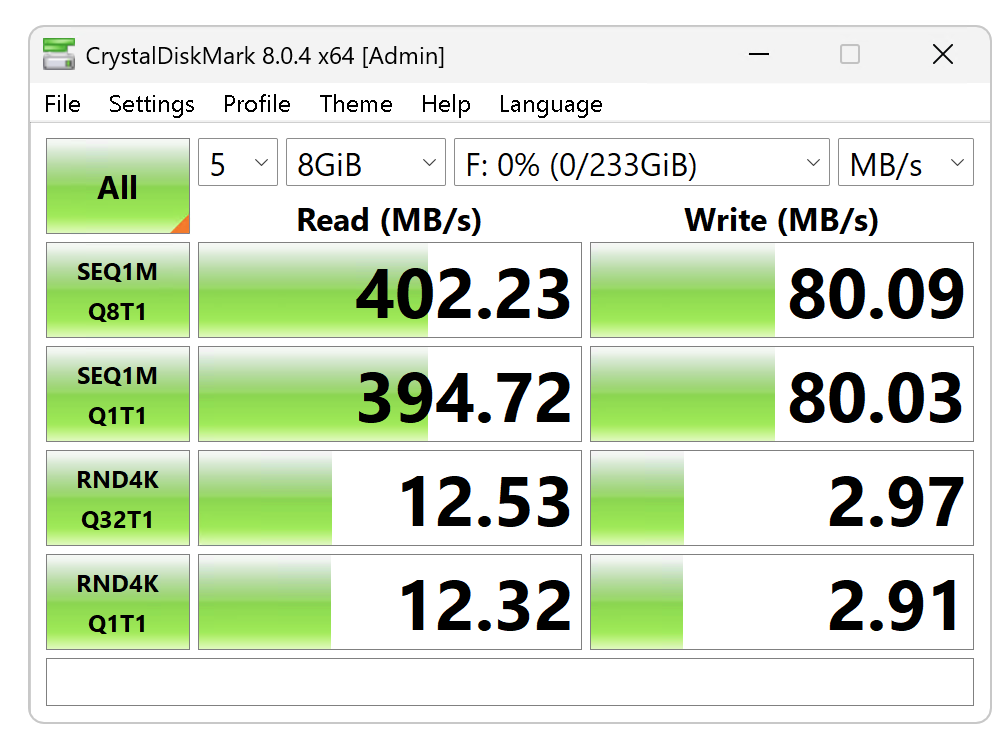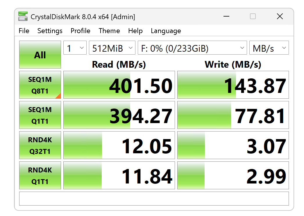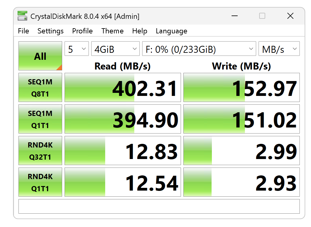 Alas, these low costs mirror the Crayola’s efficiency. It reads quick sufficient at 400MBps, however write pace begins out sluggish at 150MBps and drops additional to 80MBps when you exceed roughly 4GB of knowledge.