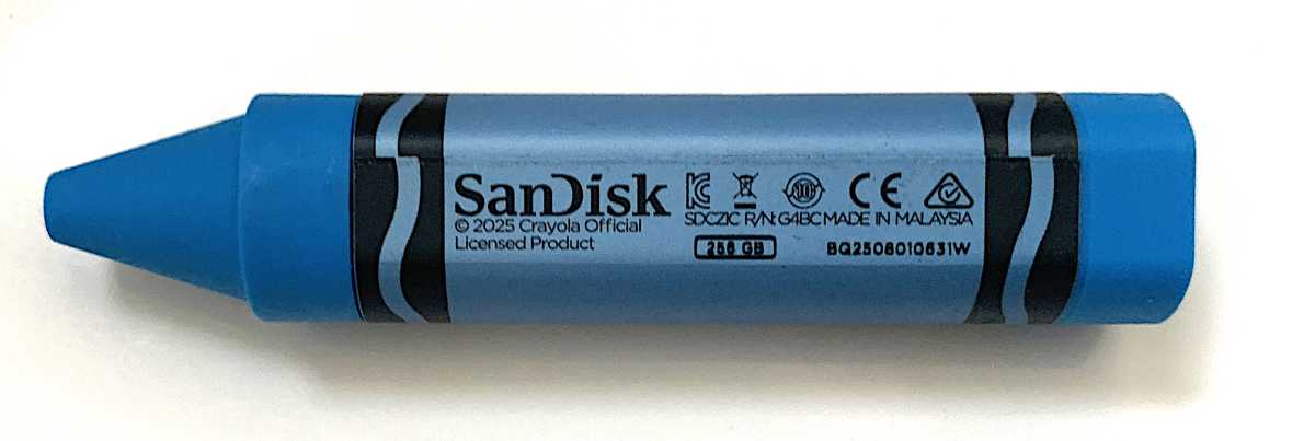 The cap covers a Type-C connector. While SanDisk doesn’t make any claims as to weather- or dust-proofing (there’s no IP score), I’m guessing that with the cap on, the Crayola may stand as much as most abuse. Note that the cap is just not captive and and SanDisk warns that the drive is just not for kids beneath three years.