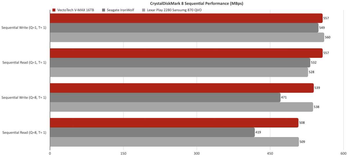 I retested two older SATA SSDs (Seagate’s IronWolf and Samsung’s 870 QVO) on our new testbed to check them to the V-MAX. Given the SATA efficiency ceiling, there’s not an entire lot of distinction however you’ll positively need to keep away from the Samsung 870 QVO (should you may even discover it) for giant writes.
